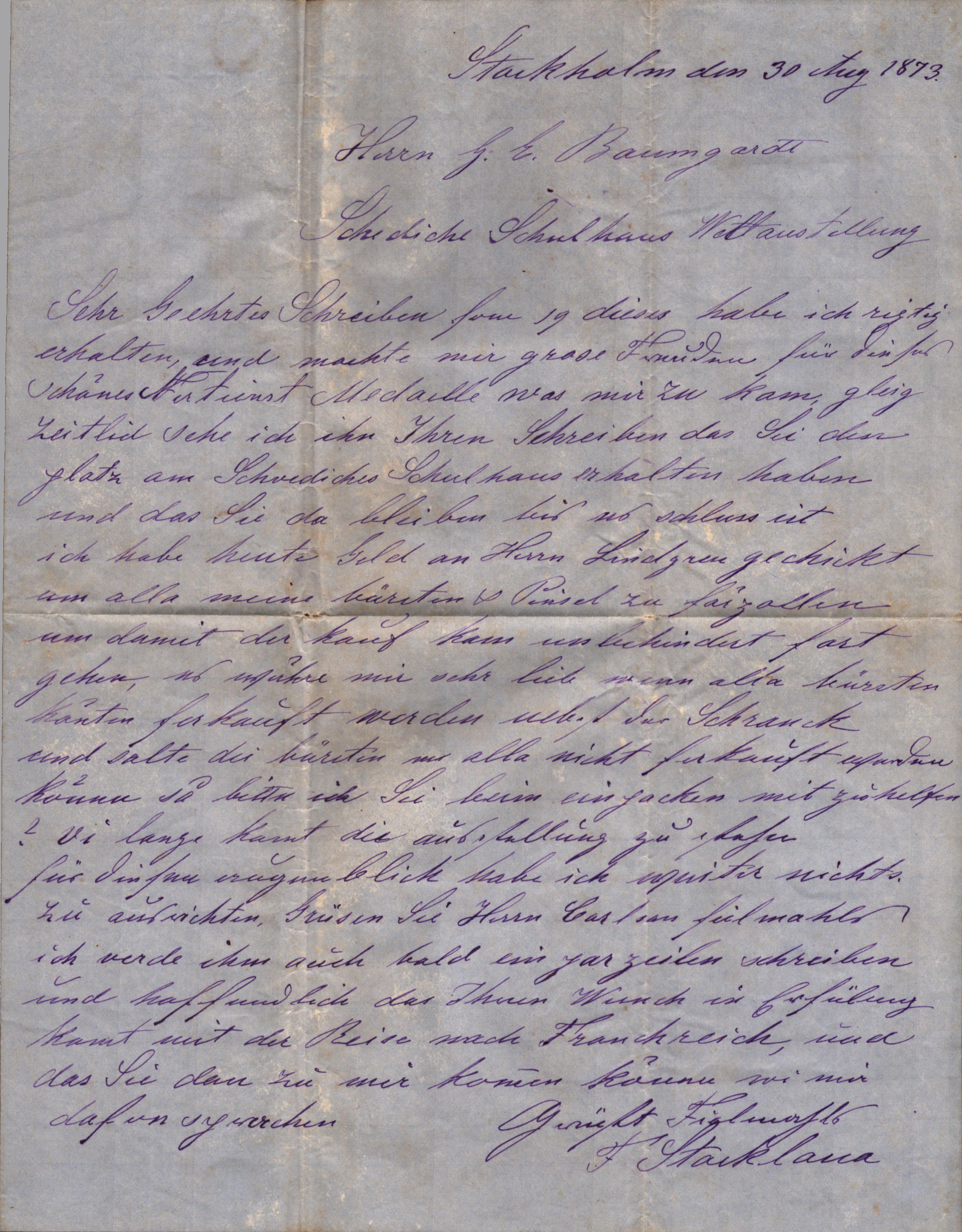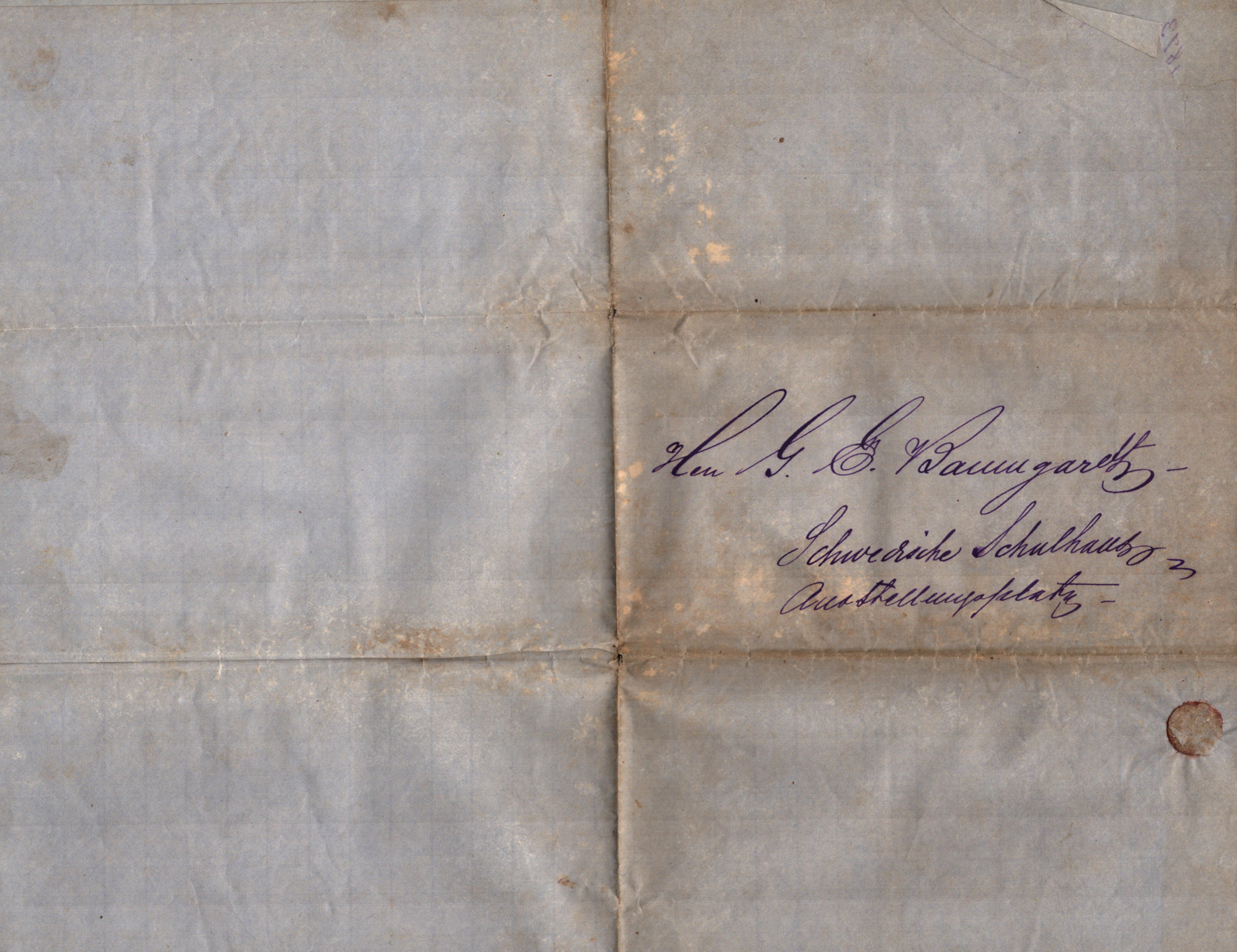 Det var en riktig Jane Austen-vikning på det här brevet, med adressen på utsidan. Det är modern skrivstil här (alltså inte den tyska stilen som på dokumenten ovan), så det här kan ni läsa själva och kolla om min avskrift är rätt. Jag kunde inte tyda alla ord. Brevet är från Frans Stocklassa, alltså G.E. Baumgardts f.d. arbetsgivare. Jag får en känsla av att Stocklassa kunde prata på tyska men inte skriva så bra.