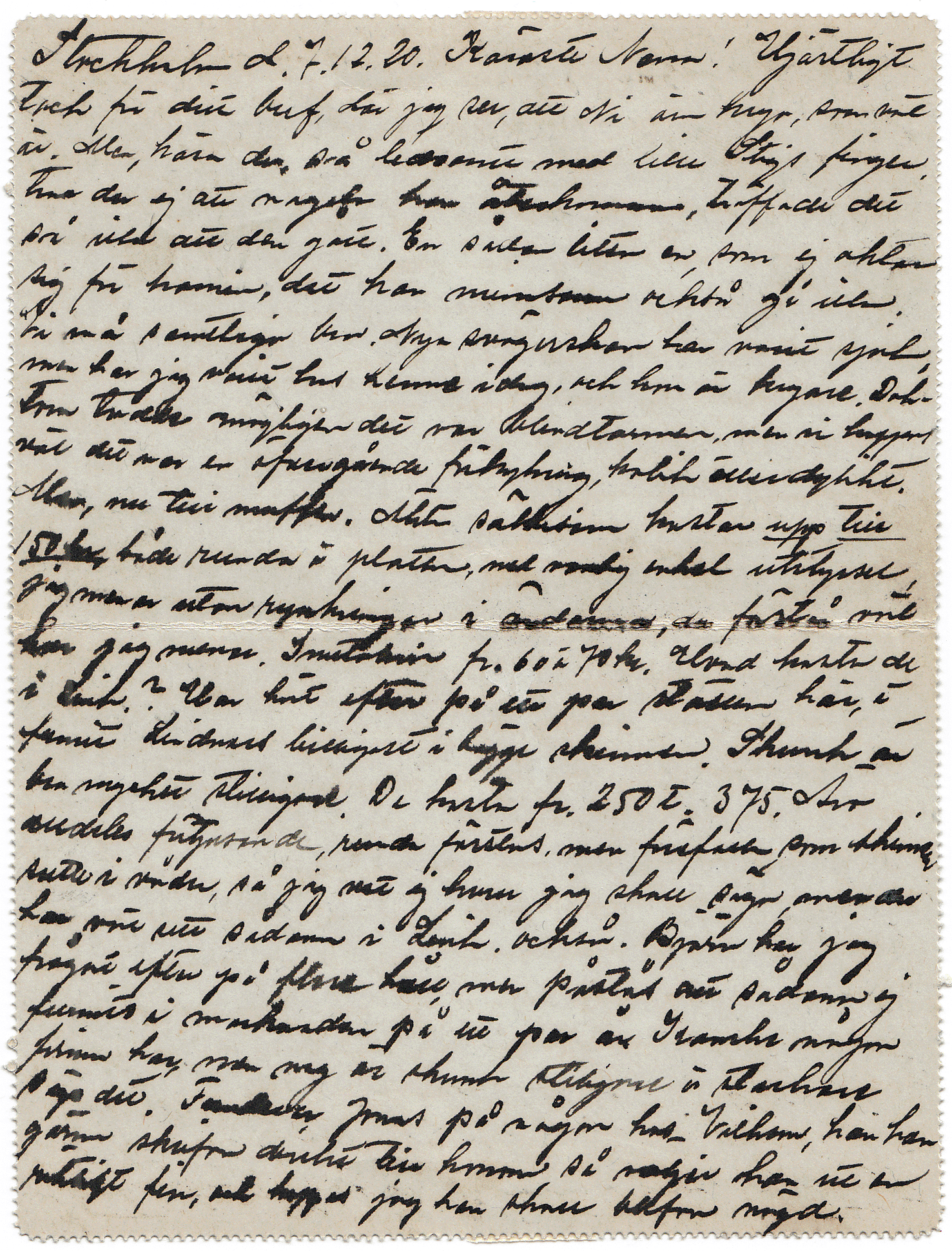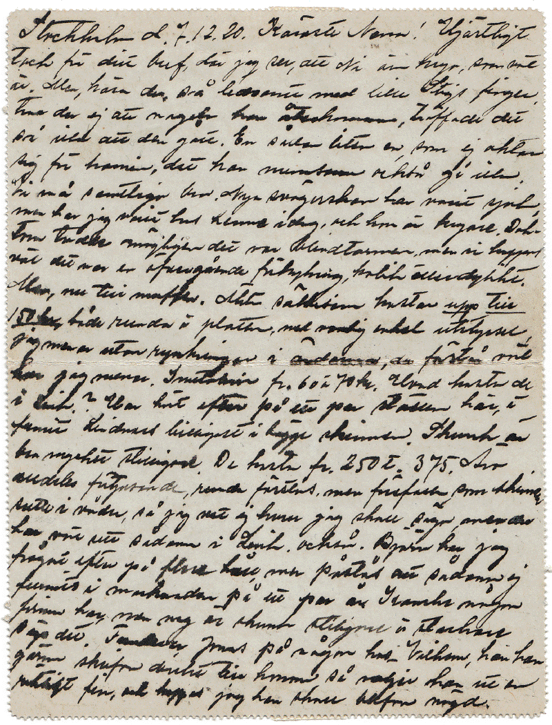 Stockholm d.7.12.20 Käraste Nana! Hjärtligt Tack för ditt bref där jag ser, att Ni är krya, som väl är. Så ledsamt med lille Stigs finger tror du ej att nageln kan återkomma, träffade det så illa att den gått. En sådan liten en, som ej aktar sig för kamin, det kan minsann också gå illa. Vi må samtliga bra. Nya svägerskan har varit sjuk, men har jag varit hos henne idag, och hon är kryare. Doktorn trodde möjligen det var blindtarmen, men vi hoppas väl det var en övergående förkylning, kolik eller dylikt. Men, nu till muffen. Äkta sälskinn kostar upp till 150 kr, både runda å platta, med vanlig enkel utstyrsel, jag menar utan rynkningar i ändarna, du förstår väl hur jag menar. Imitation fr. 60 á 70 kr. Vad kosta de i Link.? Har hört efter på ett par ställen här, och funnit Lindners billigast i bägge skinnen. Skunk är bra mycket stiligare. De kostar fr. 250 t. 375 kr alldeles förtjusande runda förstås så jag vet ej huru jag skall säga men du har väl sett sådana i Link också. Björn har jag frågat efter på flera håll men påstås att sådana ej funnits i marknaden på ett par år. Kanske någon firma har, men shimm är stiligare och starkare sägs det. Funderar Jonas på någon hos Vilhelm, kan han gärna skrifva direkt till honom så väljer han ut en riktigt fin och hoppas jag han ska blifva nöjd.