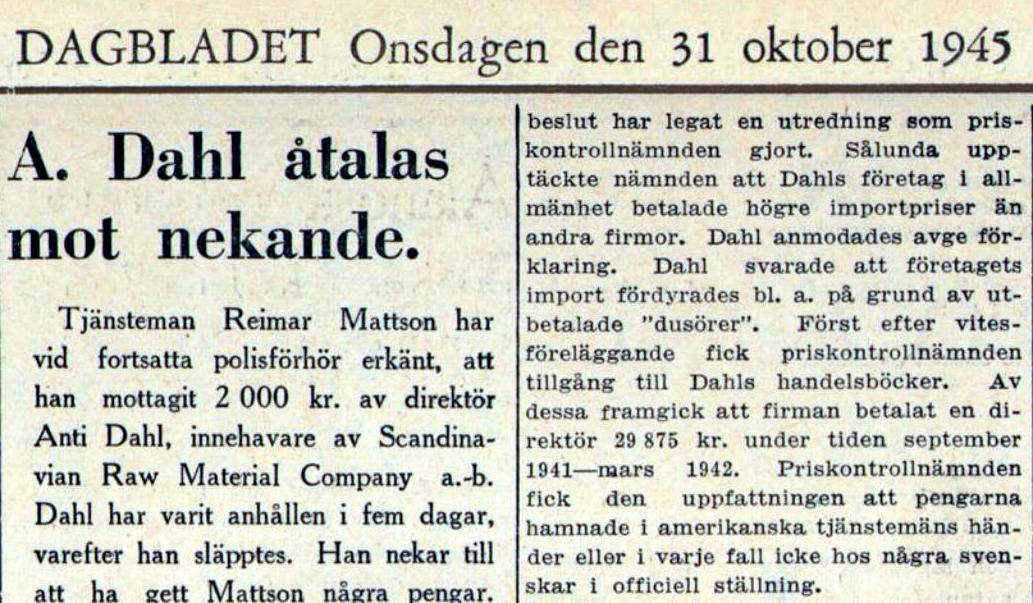 Anti Dahl anklagades för att ha varit en av dem som betalat mutor i en härva som var förstasidesstoff i SvD 1945.