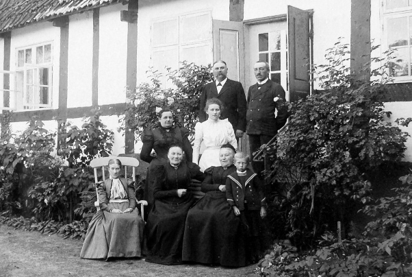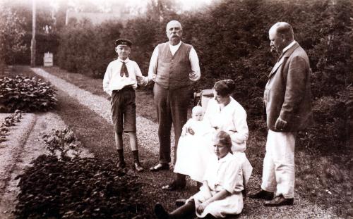 Detta fotografi är taget på samma plats som ovanstående, troligen år 1900. Längst fram sitter de tre systrarna Dam, från vänster räknat Augusta, Marie och Trine. Överst på trappan står min Morfar, som också hette Adolf Dam, samt hans svåger handlanden Oscar Nilsson, gift med Morfars syster Trina. I mellanledet står min Mormor Josefina och min Mor Juliana (Nana) född 1883. Främst till höger, bredvid Trine Dam, står Oscar och Trina Nilssons son Ivar, född 1892. Augusta avled i nov. 1901 och fotot måste alltså vara taget senast det året. Husfasaden är vänd mot norr. Framför den är trädgården.