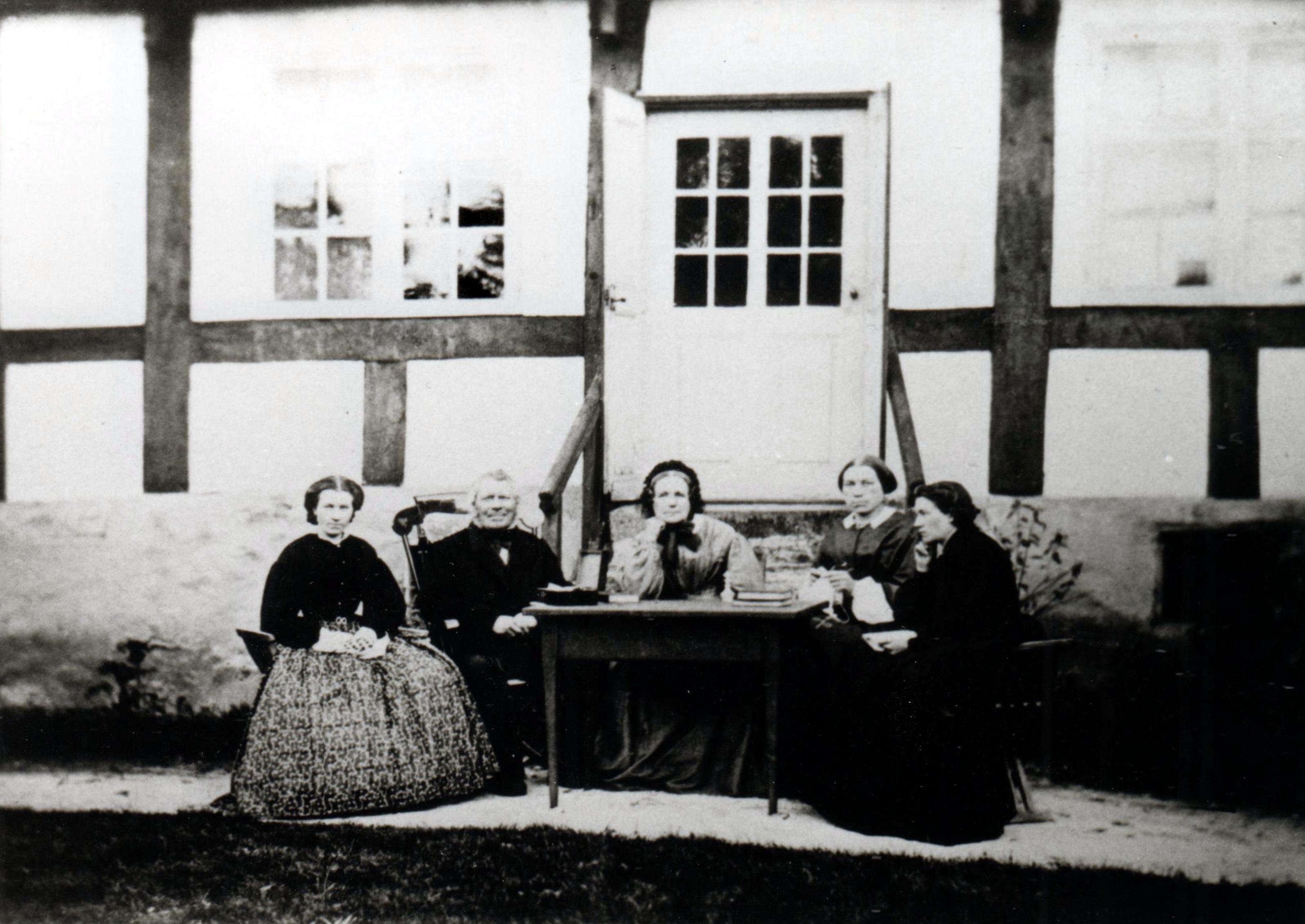På detta fotografi från Rönne ser man hela familjen Adolph Müller Dam utom sonen Carl sittande utanför den del av Dams hotell, som utgjorde privatbostad för hotellägarens familj. Personerna är från vänster räknat dottern Augusta, Adolph själv, hans hustru Juliane samt döttrarna Marie och Trine. Fotot måste vara taget senast 1868, eftersom Adolph avled i aug. det året.