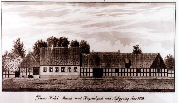 Denna teckning visar Dams Hotells fasad mot Krystalgade, alltså mot söder, efter en ombyggnad, ombesörjd av Adolph Müller Dams änka Juliane Marie under åren 1869 - 1870. Den stora ekonomibyggnaden till höger ger alltjämt hotellet en prägel av gammal gästgivaregård med stora utrymmen för hästar och vagnar, både egna och sådana som tillhörde hotellgäster. Bakom de på bilden synliga byggnaderna fanns en stor gårdsplan och bortom den låg den byggnadslänga, som bland annat innehöll familjebostaden.