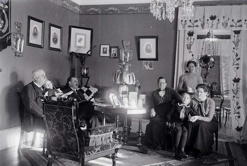 Fotografiet här ovan är taget i Morfars och Mormors salong i fabriksvillan i Boda, troligen år 1915. Rummet var möblerat med en fin möbel i svartpolerat ädelträ och klädd med plysch i en diskret grön färg. Fotogenlampan står på bordet. Elektrisk ström fanns ännu ej i Boda. Längst till vänster på fotot sitter Morfar med Greta i knät. Far sitter ensam i soffan. Till höger om bordet sitter Mormor och till höger om henne sitter Mor med mig. Bakom Mor och mig står Emmy. Till höger om henne ser man en skymt av matsalen eller matrummet, som vi brukade säga. Det låg intill husets östra gavel. Och därifrån hade man direkt utgång till köket genom en dörr, som brukade hållas stängd när ingen skulle passera där. Från salongen konde man genom dubbeldörrar komme direkt ut på stora verandan. Matsalen, salongen och Morfars kontorsrum låg i fil mot söder.