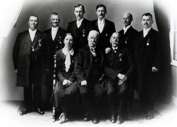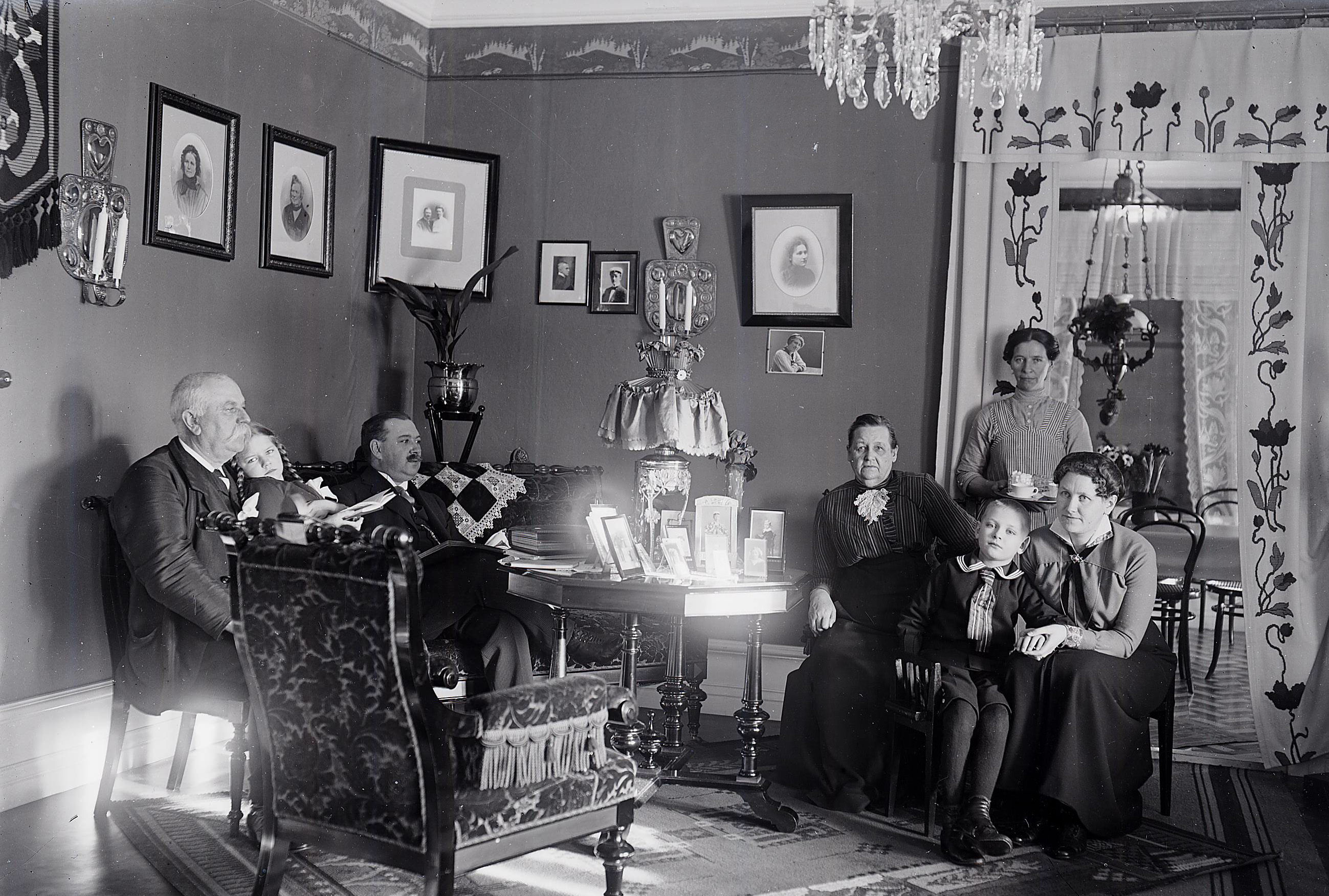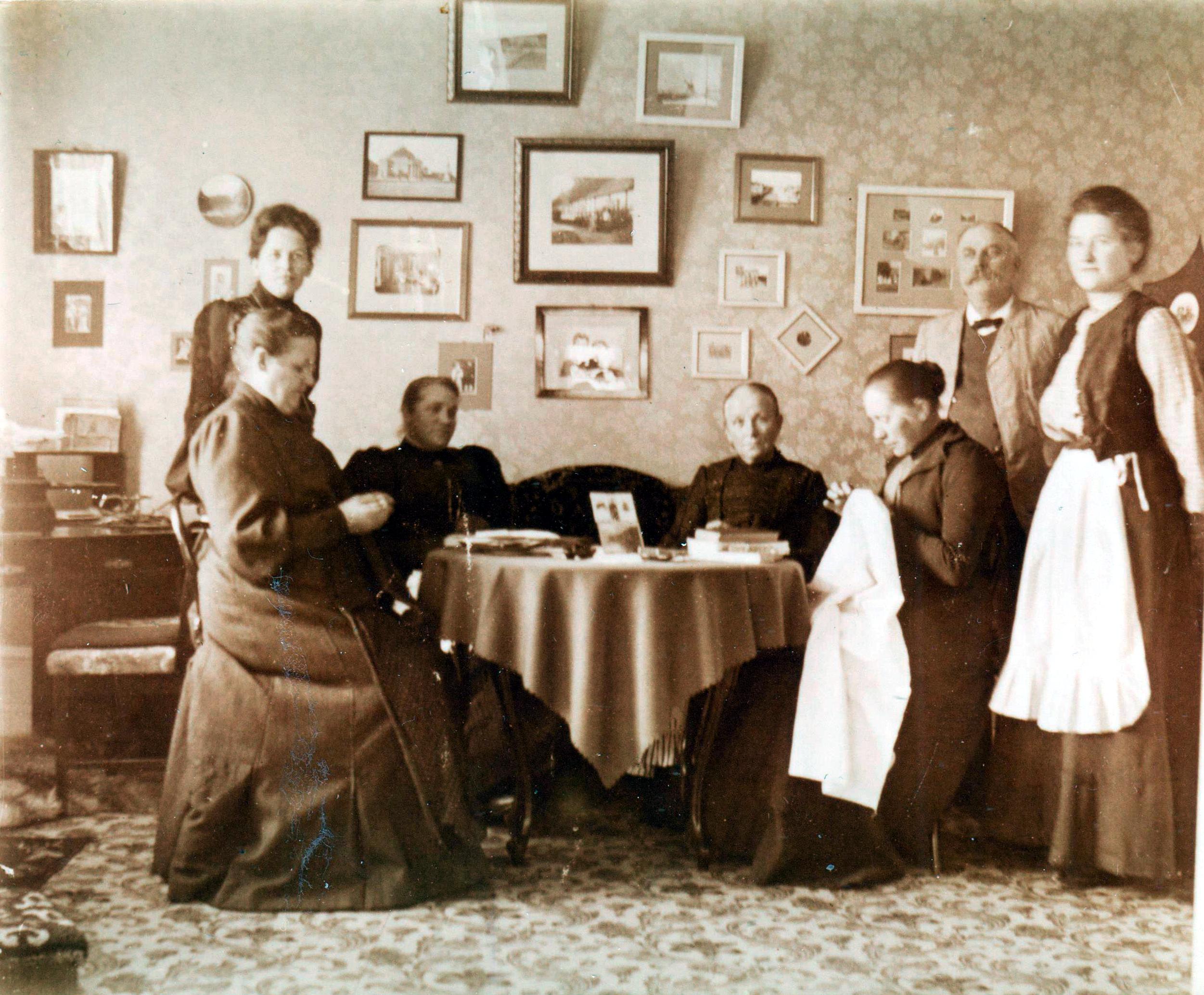 Detta foto är taget vid ungefär samma tid som fotot ovan. Det är taget i det rum i fabriksvillan, som när fotot togs var Mors rum men som, sedan hon gift sig 1906, blev Morfars kontorsrum. Mor står längst till höger på bilden och intill henne står Morfar. Damen, som står till vänster på bilder, är Anna Petersson i Pataholm, senare gift Hertzman. De sittande är från vänster räknat: Mormor, faster Helen, Anna Peterssons mor Johanna Petersson, Pataholm, och faster Anna, som tydligen på skämt tagit till sig någon annans handarbete. Hon ägnade sig eljest aldrig åt traditionellt kvinnliga sysslor.