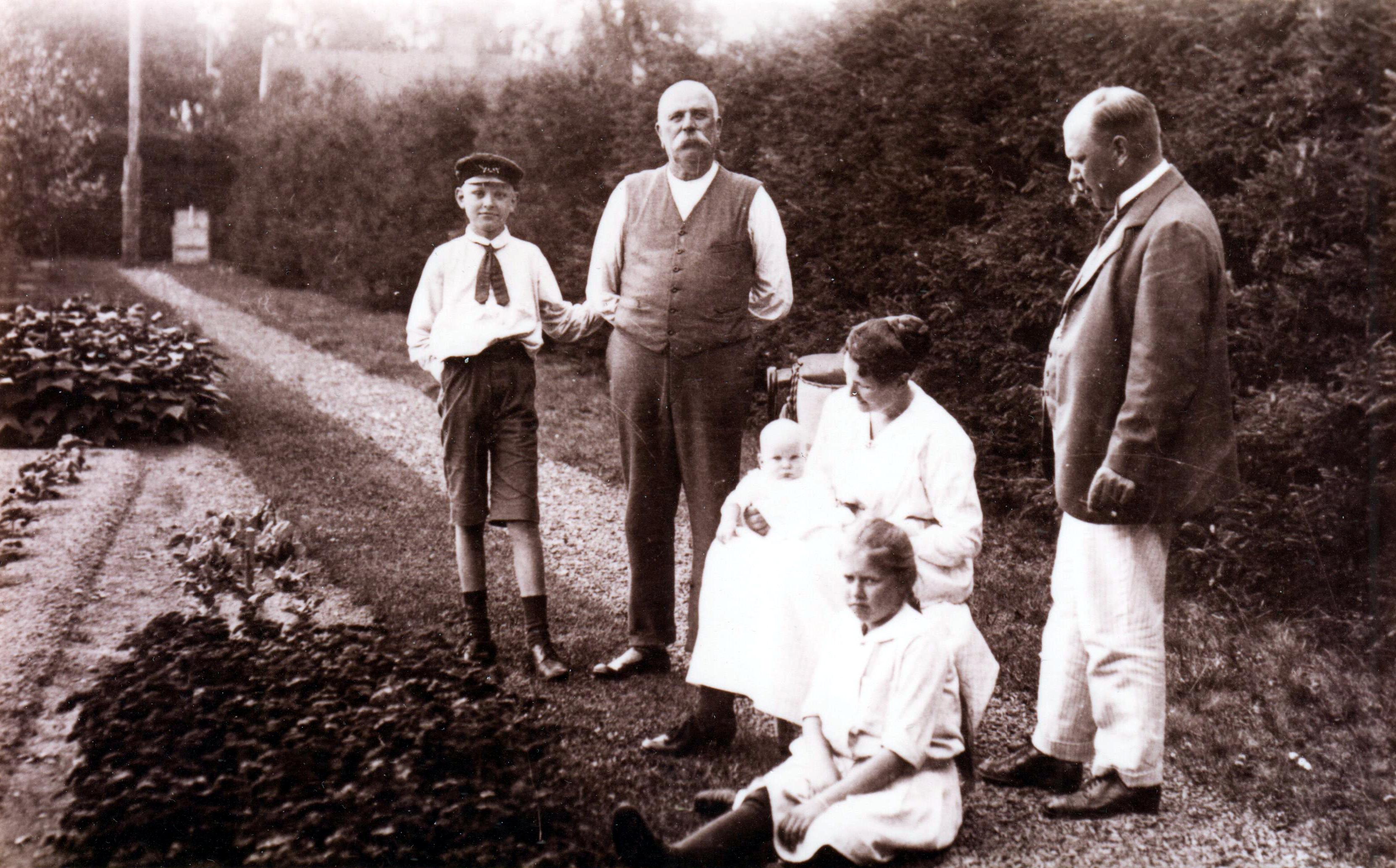 Detta fotografi är taget i Boda sommaren 1919, det år då min bror Stig föddes den 23 febr. Morfar och jag står längst till vänster. Mor sitter i en stol med Stig i knät. Greta sitter framför. Far står längst till höger. Bakom oss alla är den granhäck, som Morfar planterat vid gränsen mot det område, som användes till arbetarbostäderna. Till vänster synes en smula av den del av Morfars trädgård, som låg väster om villan. - Mormor var ej längre i livet när kortet togs.