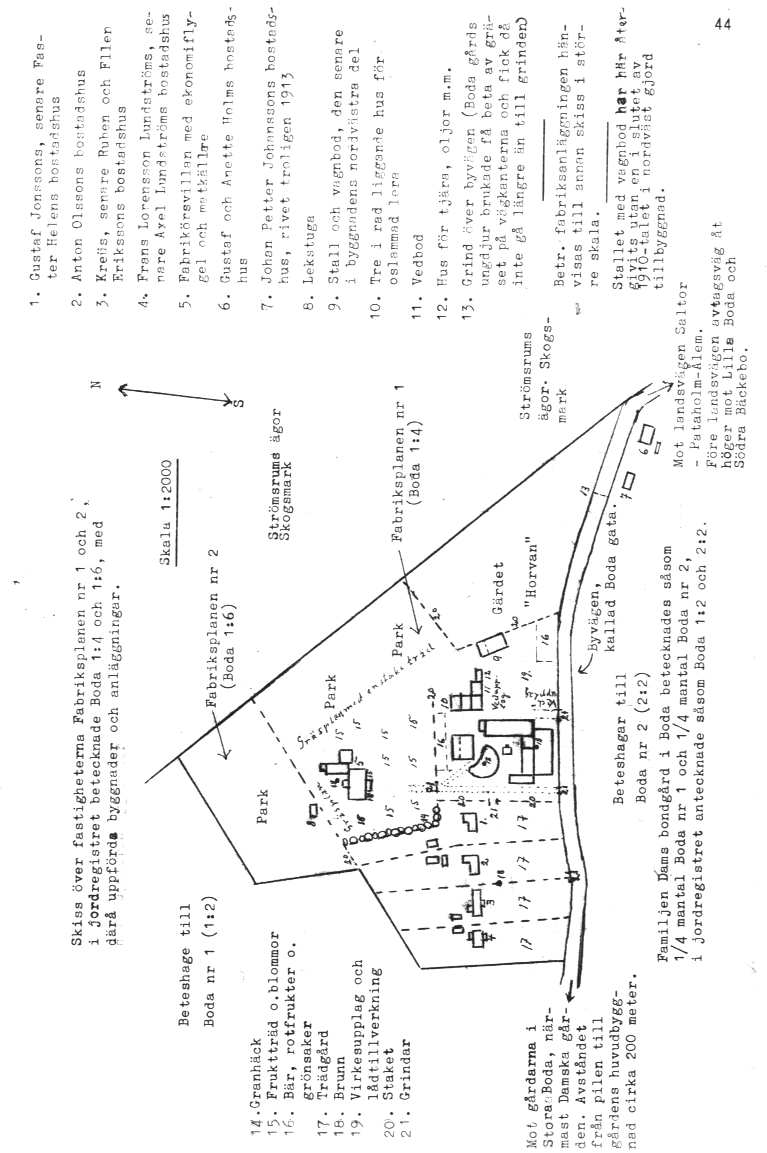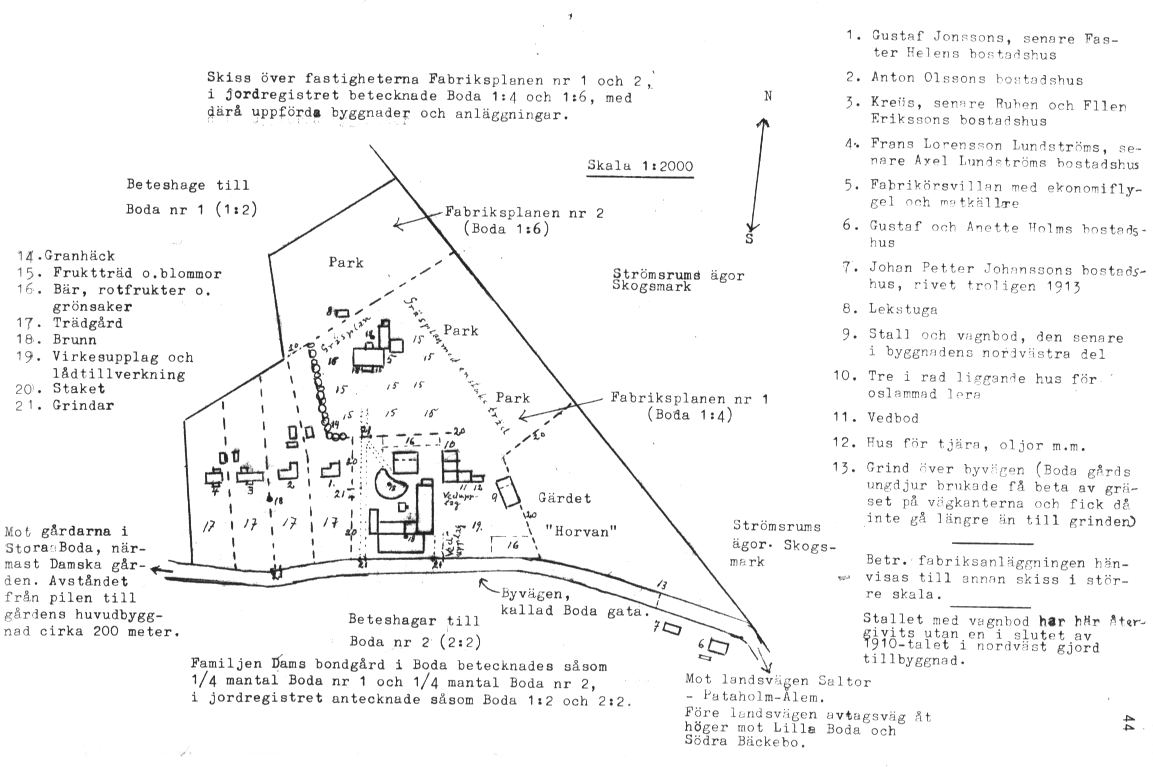 Priset 13.000 kronor var naturligtvis väldigt lågt. Vi hade förut begärt betydligt mera, men i en anvisning till två fastighetsmäklare i Kalmar hade jag på senhösten 1938 gått ner till 18.000 kronor. Trots det hade jag inte fått anvisning på någon enda spekulant. Taxeringsvärdet för Boda 1:4 och 1:6 tillsammans hade under den tid fabriken var i drift varit 23.000 kronor, men det hade sedan driften lagts ner sänkts till 15.000 kronor. Det värdet inkluderade värdet av de markområden, som avstyckades 1939 för arbetarbostäderna och som inte omfattades av försäljningen till Hanna Olsson.